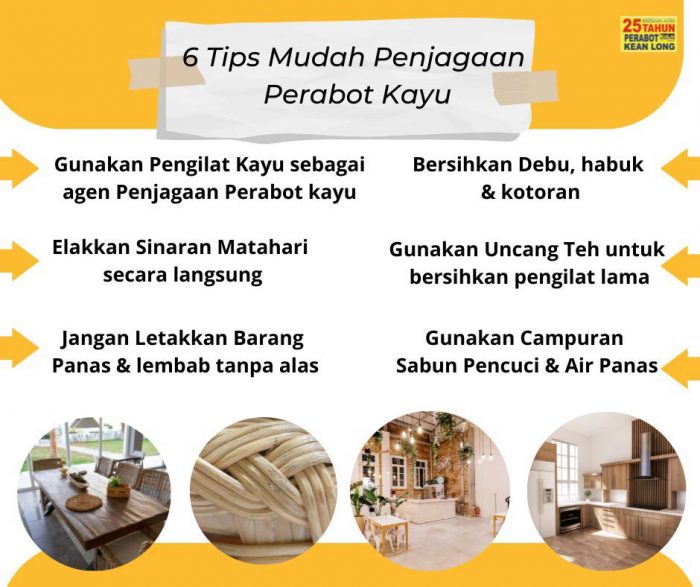 Oleh itu, kerap bersihkan debu, habuk & kotoran pada permukaan perabot. Gunakan kain yang kering dan lembut untuk mengelakkan permukaan kayu basah dan mengakibatkan permukaan mengembung.