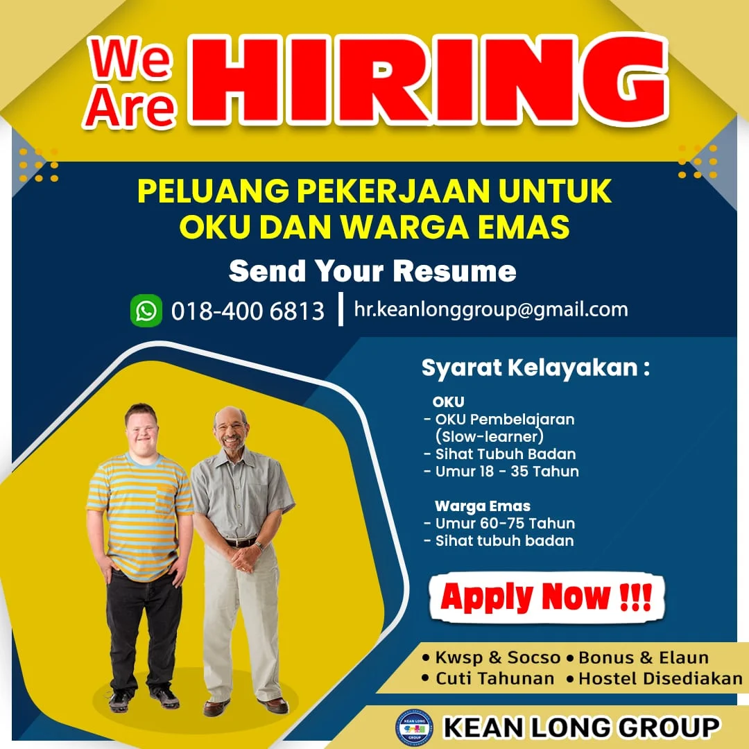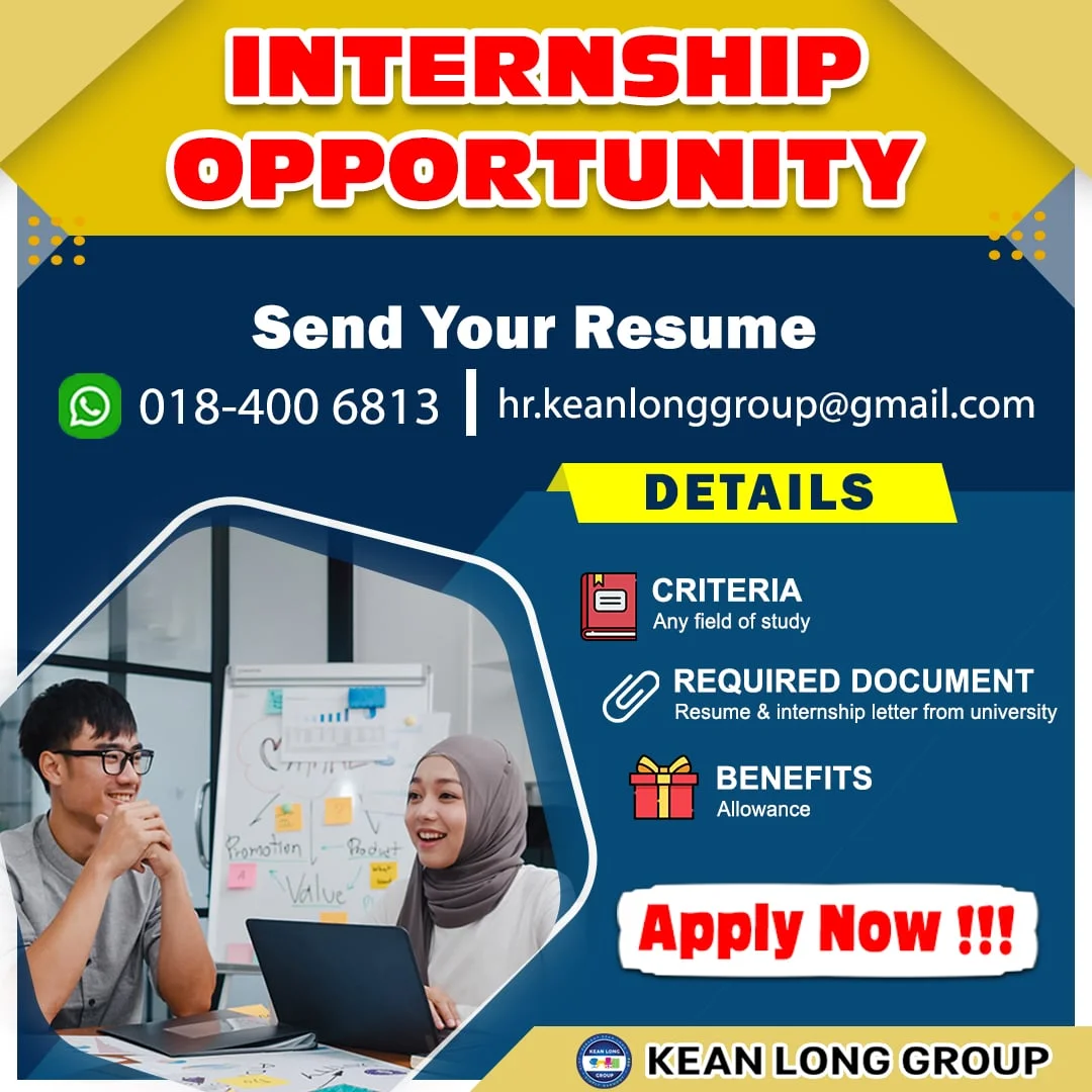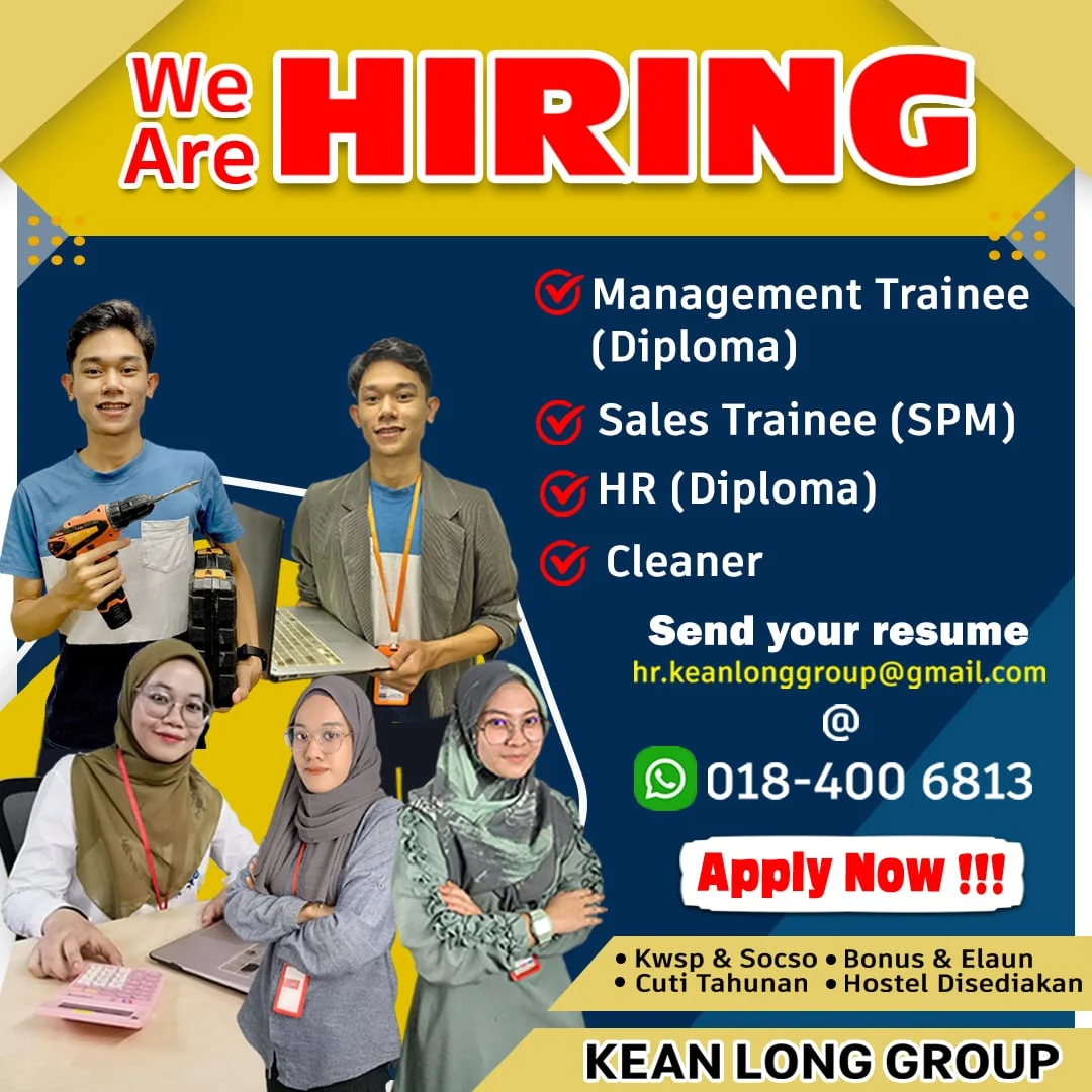 Apakah anda seorang yang berimpian tinggi, mempunyai minat dan komitmen yang tinggi untuk mencapai kejayaan bersama kami, sila hantarkan resume anda sekarang!! Jangan lepaskan peluang ini untuk menjadi sebahagian daripada pasukan kami yang dinamik dan berjaya. Terima kasih.